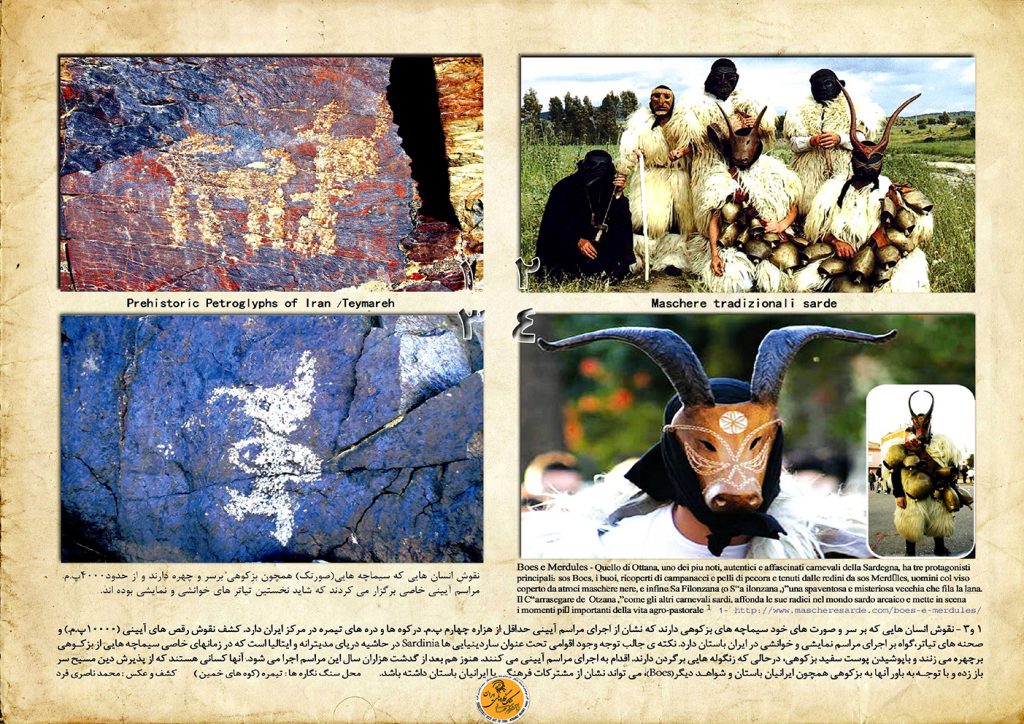 نکته ی جالب توجه آنکه این مراسم توسط اقوام ساردینیایی هم اکنون در حاشیه دریای مدیترانه و ایتالیا به نام مراسمBoes اجرا می شود . پوشش های سفید و پشم دار با زنگوله های متعدد و گوناگون که به کمرمی بندند و سیماچه های شاخدار بزکوهی که بر سر و چهره دارند؛ در محل هایی خاص اجرا مراسم می کنند؛ که خیلی دقیق تر و نزدیک تر به نقوش سنگ نگاره های کهن و پیکره های کهن مکشوفه در ایران هستند؛ آیین گردانی می کنند.