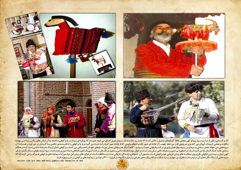 بزکوهی سفید رنگ در باور ایرانیان باستان، فرشته ی ناجی انسان ها در سختی ها بوده است و در آن دو باور آیینی کهن، بزکوهی را در قالب سیماچه هایی بر سر و صورت هنرمندان ناقالی و پیکره هایی چوبی دست ساز همچون بزکوهی در آذربایجان، که هنرمندان تکم چی، پیکره های بزکوهی را به زیبایی آراسته می کنند و بر نوک چوبی قرار داده و سپس از یک صفحه ی چوبی عبور داده وهنرمند با یک دست صفحه ی چوبی را می گیرد و با دست دیگر میله ی چوبی که پیکره بز یا بزکوهی فراز آن است؛ را می چرخاند و سروده هایی را با گویش زیبای آذری می خواند و نوازندگانی هم گاها او را همراهی می کنند. مضمون اشعار و سروده ها، تقریبا مضمون پیام کهن بزکوهی ناجی در کهن اسطوره ی ایرانیان باستان است(ماری و ماریانه).