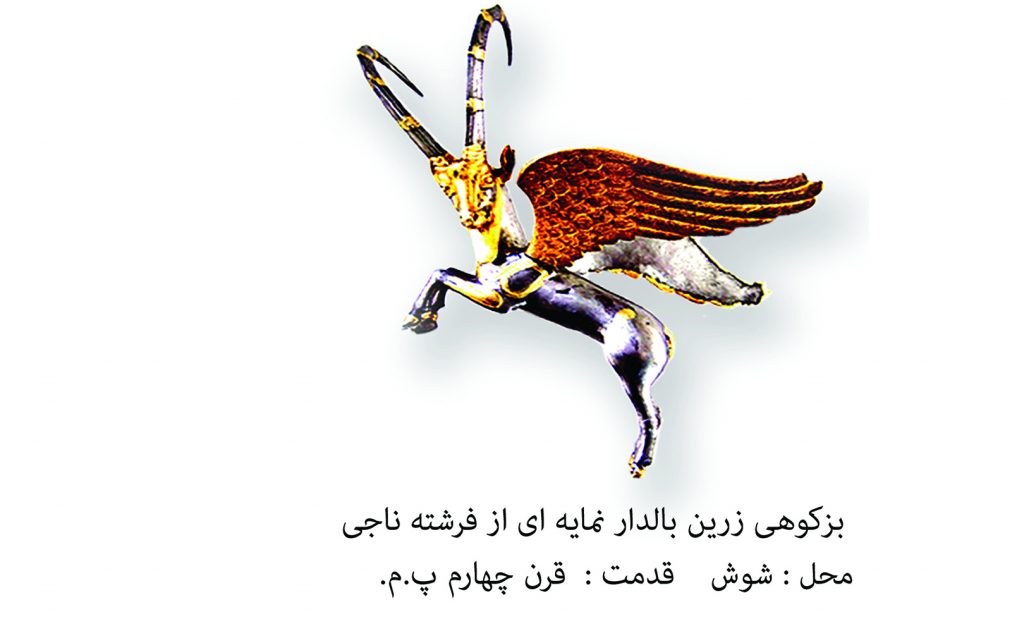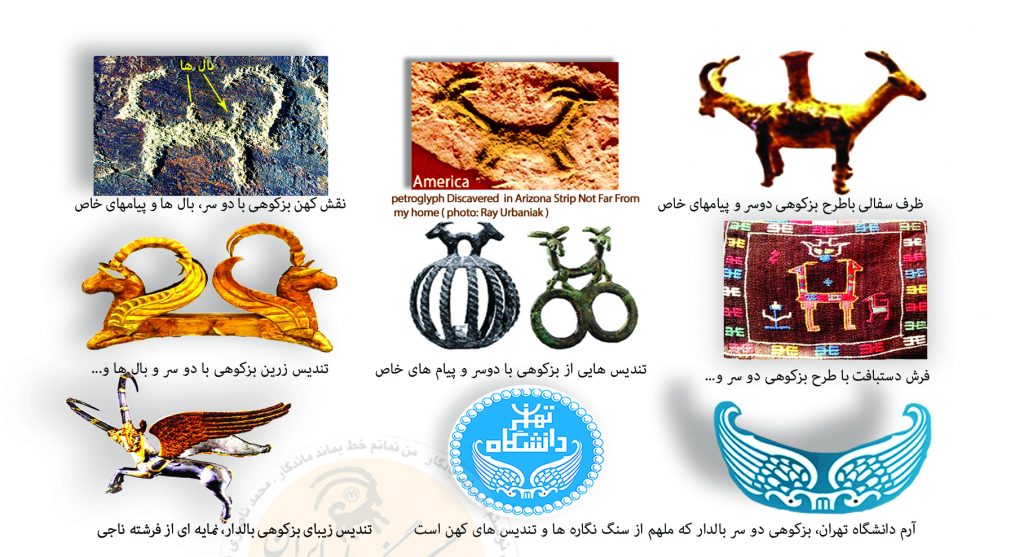 نمادی بسیار زیبا، پیچیده و پر از پیام (نماد ایران باستان) ! طرح یک بزکوهی با دو سر و دو بال( تاکید بر خواسته) که ریشه ی کهن تر آن را در میان نقاشی های غارها و کوه های ایران(حدود 5000پ.م.)، تندیس های مفرغی و زرین (500 تا 3000 پ.م.)، دست بافت ها( دوره تاریخی)، هم در قالب فرشته ناجی و فزونی دهنده ی نعمت در ایران باستان می ببینم؛ که همه ی آنها برگرفته از کهن اسطوره ی ایرانیان باستان است ( ماری و ماریانه) و ما در بالا سیر گوناگون آن را معرفی کرده ایم.