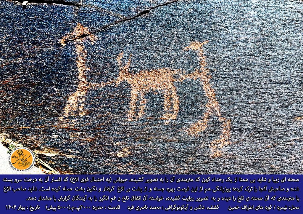 صحنه ای زیبا و شاید بی همتا از یک رخداد کهن که هنرمندی آن را به تصویر کشیده. حیوانی (به احتمال قوی الاغ) که افسار آن به درخت سرو بسته شده و صاحبش آنجا را ترک کرده؛ یوزپلنگی هم از این فرصت بهره جسته و از پشت بر الاغ گرفتار و نگون بخت حمله کرده است.