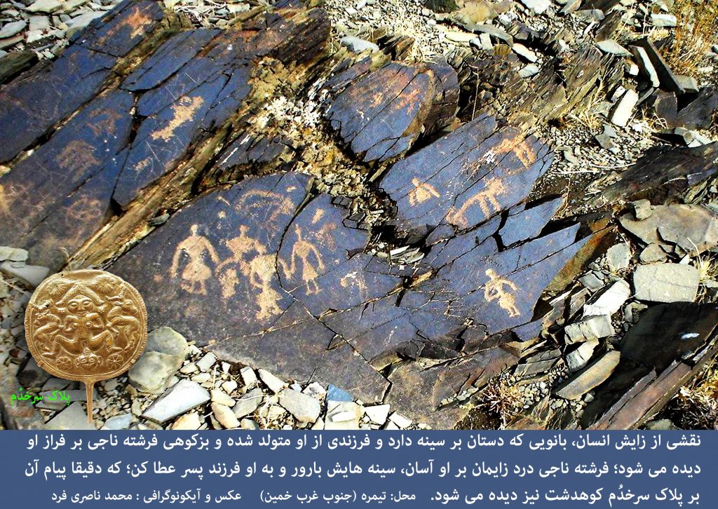 نقاشی هایی کهن (4000 پ.م.) و بی مانند از صحنه ی زایش انسان بر روی تخته سنگی، که رد پای پیام آن را بر روی پلاک سنجاق سرخدُم کوهشت لرستان (1000 پ.م.) هم می بینیم.