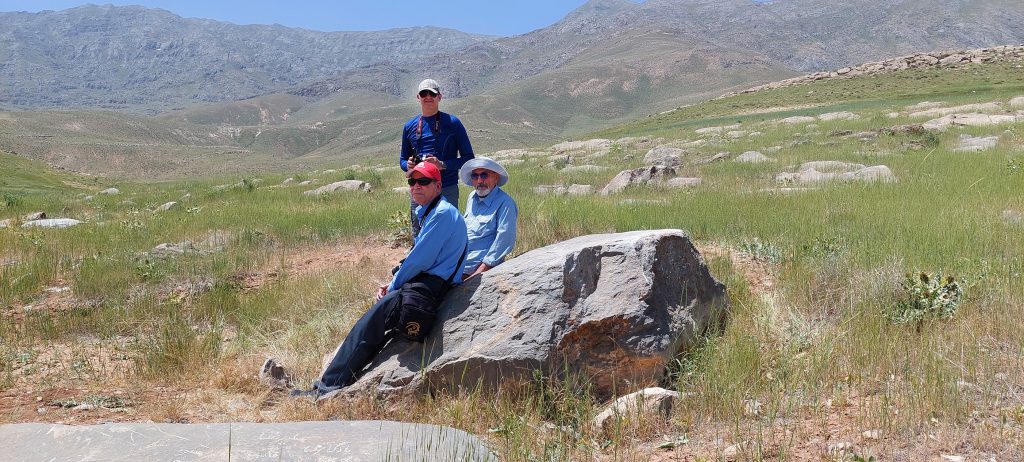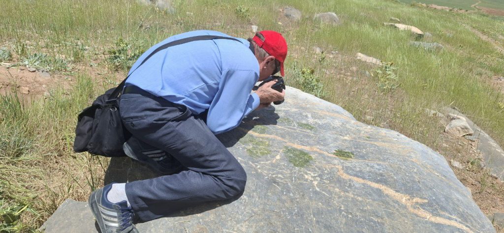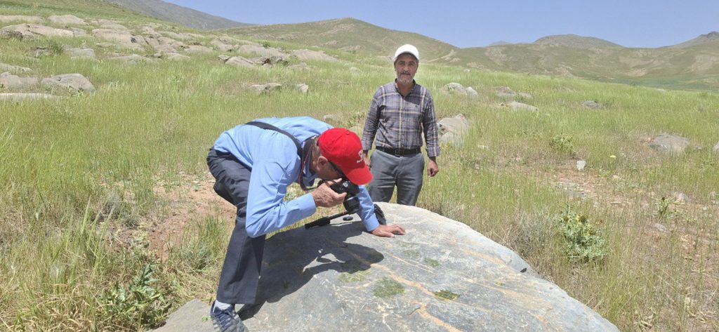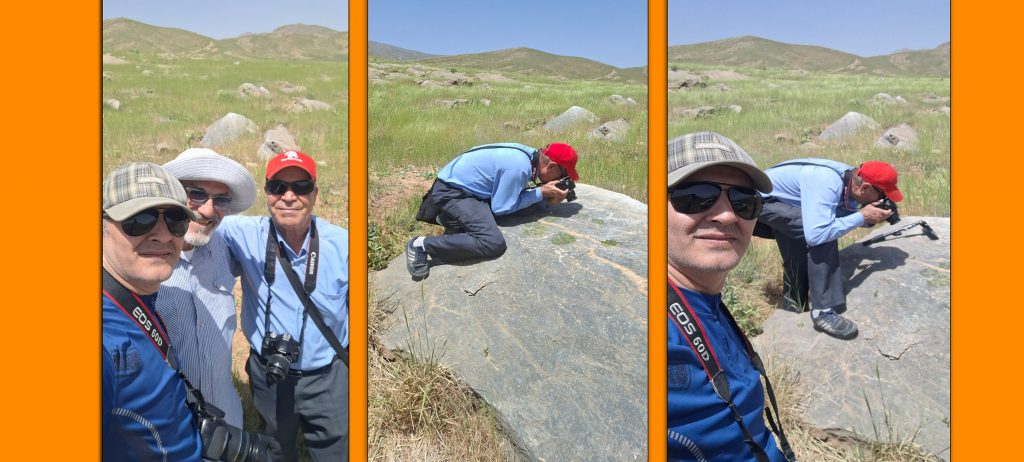 به تخت سنگ بزرگی در پایین یک تپه ی سر سبز رسیدیم. جناب عسگری اتومبیل را پارک کردند و نزدیک تخته سنگ شدیم. هر چه دقت کردیم چیزی دیده نمی شد (خورشید عمود می تابید)؛ چون حدود ساعت 12 ظهر بود و نقش ها هم بعلت قدمت زیاد و تاثیرعوامل طبیعی هم رنگ بستر شده بودند.