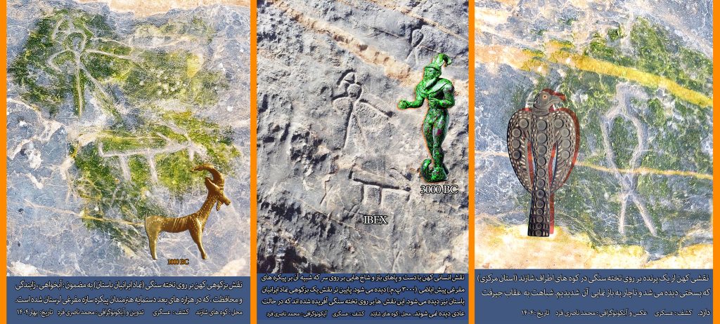 نقش یک پرنده شبیه عقاب سنگ صابونی جیرفت، انسانی که دست و پاهای باز داشت و دو شاخ بر سر شبیه پیکره های مفرغی و زرین پیش ایلامی مکشوفه و نقش بزکوهی نماد ایرانیان باستان بویژه ایلام کهن و نوعی علایم خطی که نیاز به بررسی بیشتر دارد و … .