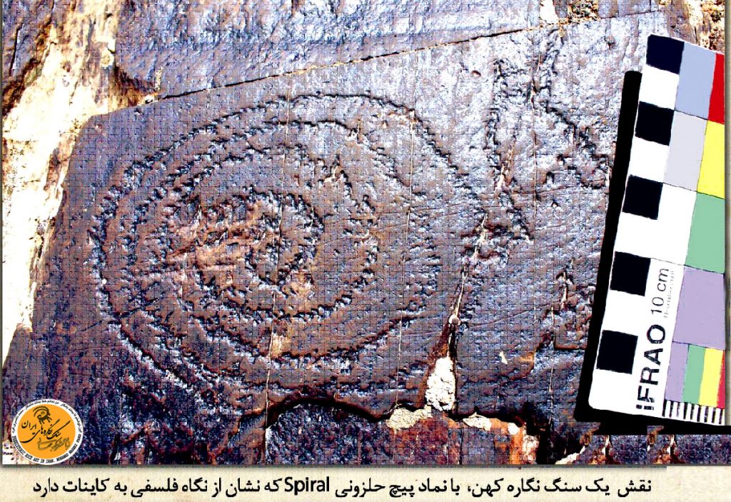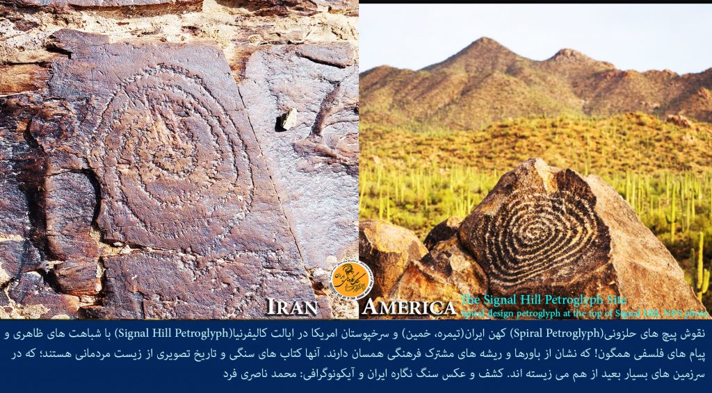 نقوش پیچ های حلزونی (Spiral Petroglyph) کهن ایران (Teimareh/ Khomein) و سرخپوستان امریکا در ایالت کالیفرنیا(Signal Hill Petroglyph) با شباهت های ظاهری و پیام های فلسفی همگون(همه ی کاینات از قانون پوشیده در آن پیروی می کنند)! که نشان از دانش، باورها و ریشه های مشترک فرهنگی همسان در نگاه و نقاط بسیار دور از هم دارند. آنها کتاب های سنگی و تاریخ تصویری از زیست مردمانی هستند؛ که در سرزمین های بسیار دور از هم می زیسته اند.
