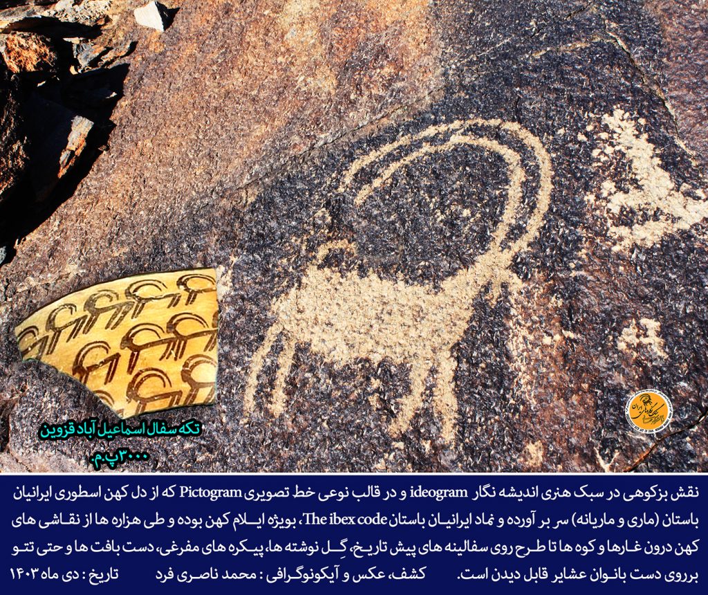 نقش بزکوهی در سبک هنری اندیشه نگار ideogram و در قالب نوعی خط تصویری Pictogram که از دل کهن اسطوری ایرانیان باستان (ماری و ماریانه) سر